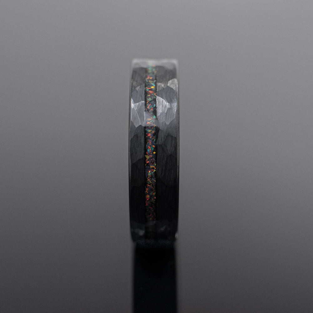a handmade 6mm Black Hammered Bello Opal tungsten Wedding Band